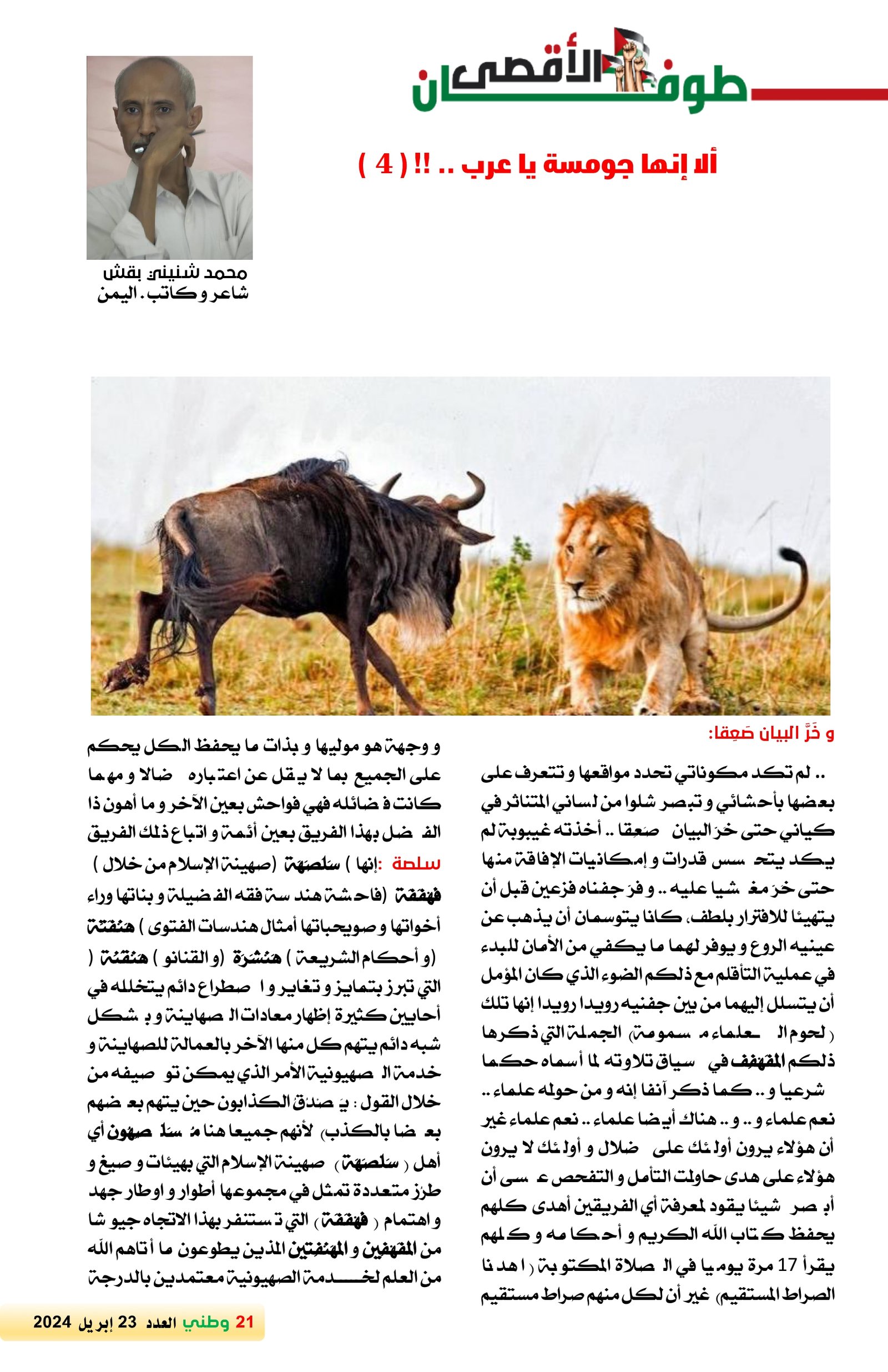 1 . في حالات الاصطراع التي شهدتها وتشهدها عدد من الاقطار العربية ... كم و كيف و لماذا يهيج الكل ضد الجميع بهذه الحالات كم و كيف و لماذا الكل عدو الجميع و الكل يقرأ آيات الجهاد كقول الله سبحانه و تعالى ( فقاتلوا أولياء الشيطان) و ( قاتلوهم يعذبهم الله بأيديكم) كم و كيف و لماذا الكل بهذه الحالات يدعو الله سبحانه و تعالى ( اللهم نصرك الذي وعدت ) استغفر الله سبحانه وتعالى .. أكاد أرى الأرض تخسف بي من هول ما أجد .. استغفر الله .. استغفر الله .. الكل يدعو ( اللهم نصرك الذي وعدت ) .. الكل يصر أنه على الحق و أن الله أمره و وعده بالنصر .. وكلهم لا يطيق حتى مجرد التفكير أو التذكير .. إذا كان البقَّال ( مثلا ) يحترم عملاءه و لا قطعة واحدة لا أكثر من واحد ولا يعد أحدا ببضاعة اشتراها غيره فكيف بالله ( وله سبحانه المثل الأعلى) لا شيء غير محاولة التأمل لحالات تمثل ذات قدر أوجه ( جَوْفَكَة ) جومسة الفكر من خلال استدعاء طبيعة الجواميس التي و إن كانت في الغالب لا تحمي نفسها من الضواري حولها فإنها عنيفة الاصطراع الجومسي الجاموسي وهل نبتعد عن الحقيقة أو نتجنى إذا قلنا إنها من أبرز صيغ ( سلصهة) صيهنة الإسلام أو تسخير الإسلام لخدمة الصهيونية التي تهندس وتدير مواجعنا بما لا يحصى من فنون إشعال الحرائق لتحقيق أهدافها بأقل التكاليف أو ما يوصف بالتكلفة الصفرية للحرب اذ لا تتحمل خزينة العدو أي نفقات في هذه الحرب التي تنفذ بصيغ متقدمة من ( المحارشة بين الكلللاب أو الديوك ) تلك الفاحشة المعدودة من أعمال قوم لوط ....